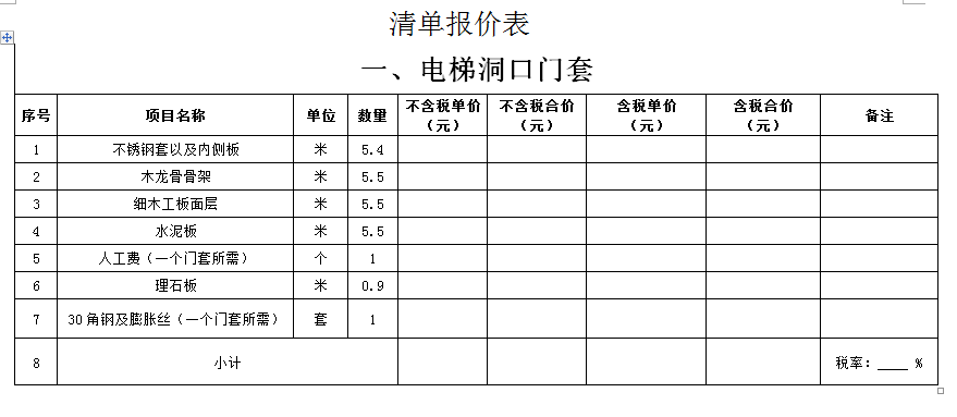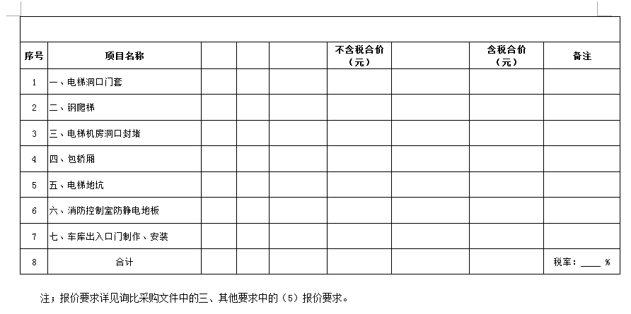 (5)采購(gòu)范圍:電梯洞口門(mén)套、鋼爬梯、電梯機(jī)房洞口封堵、包轎廂、地面找平、地下車(chē)庫(kù)出入口真石漆等(詳見(jiàn)清單)等相關(guān)工作,具體內(nèi)容詳見(jiàn)采購(gòu)文件。